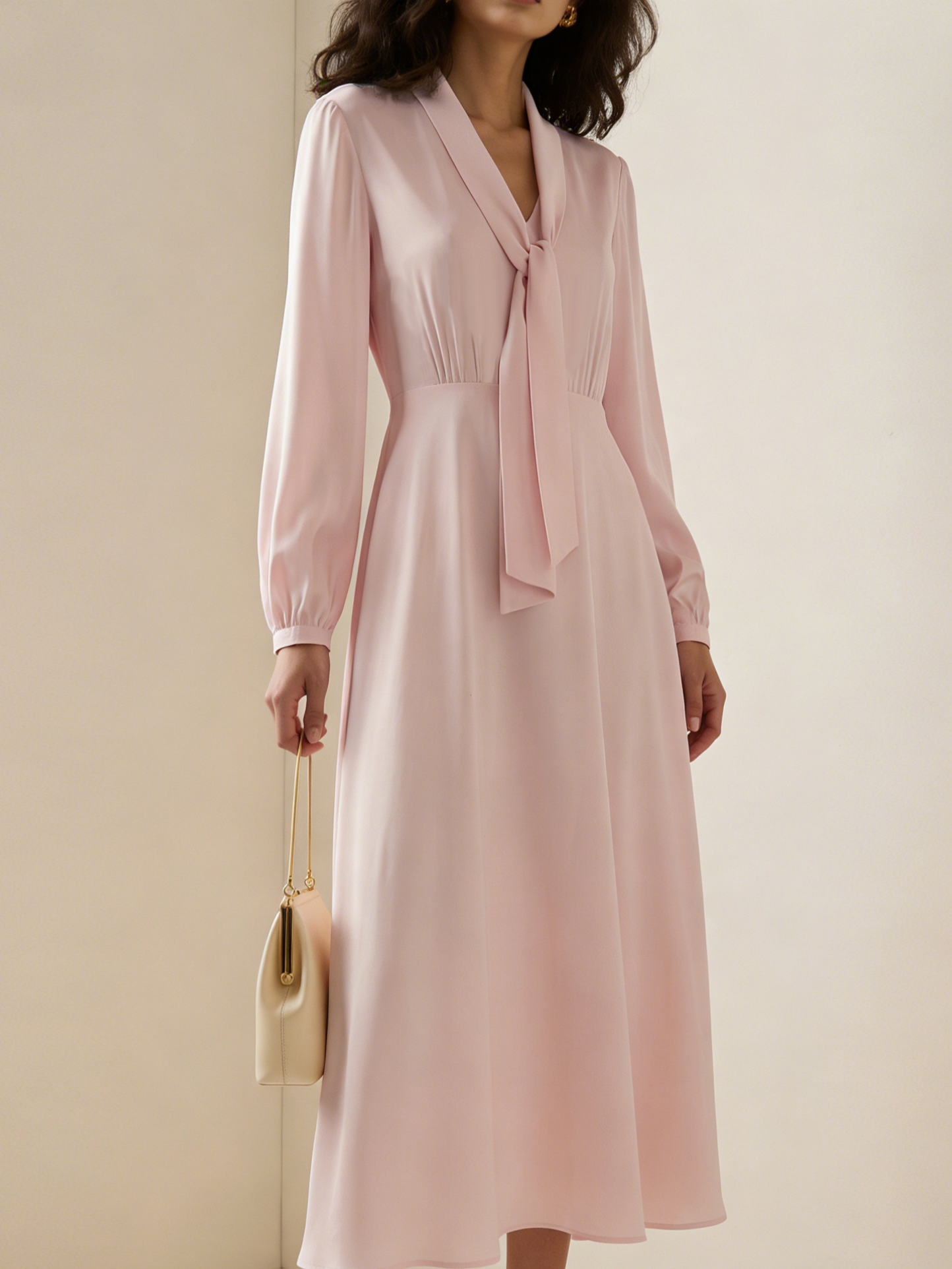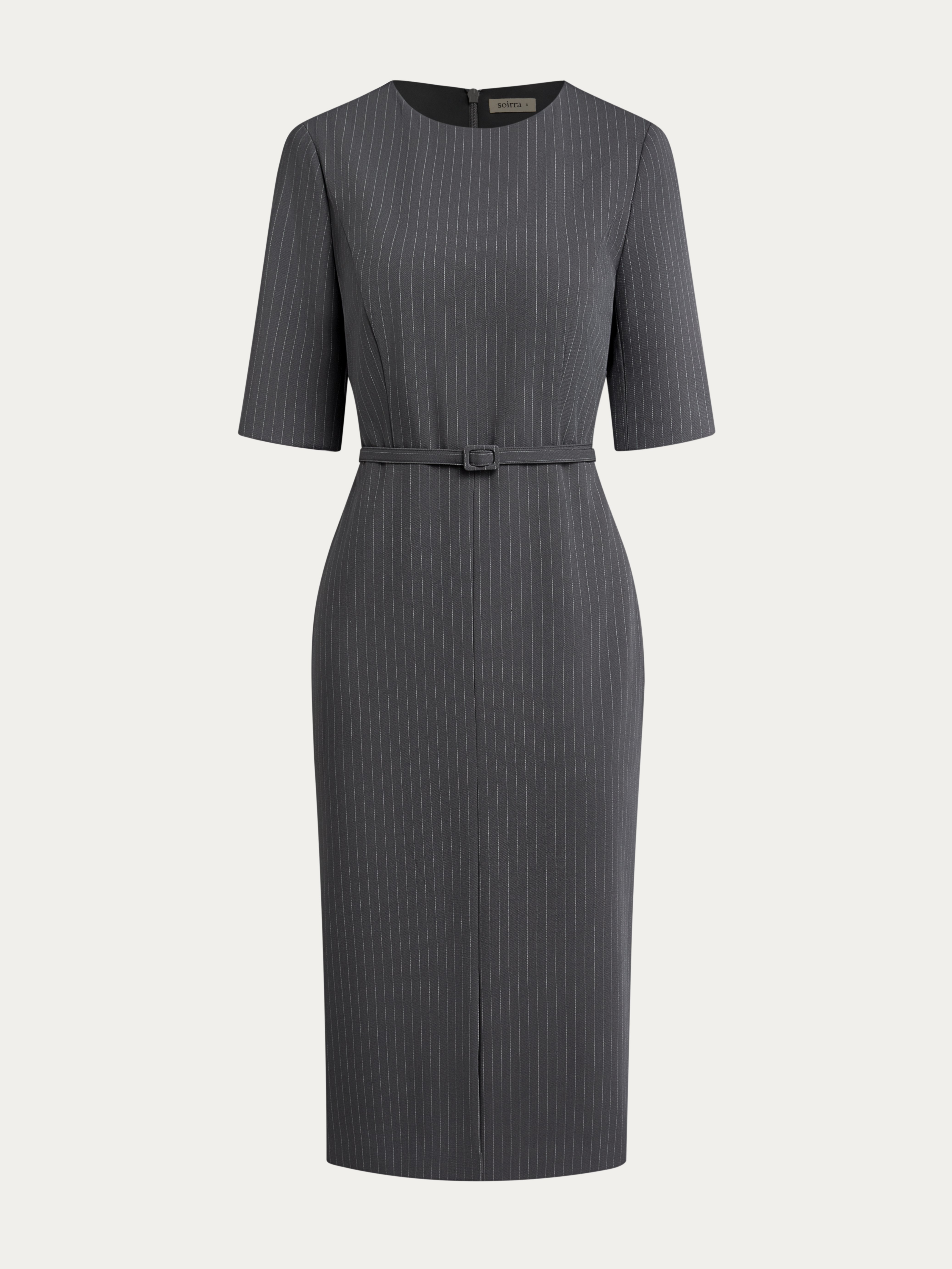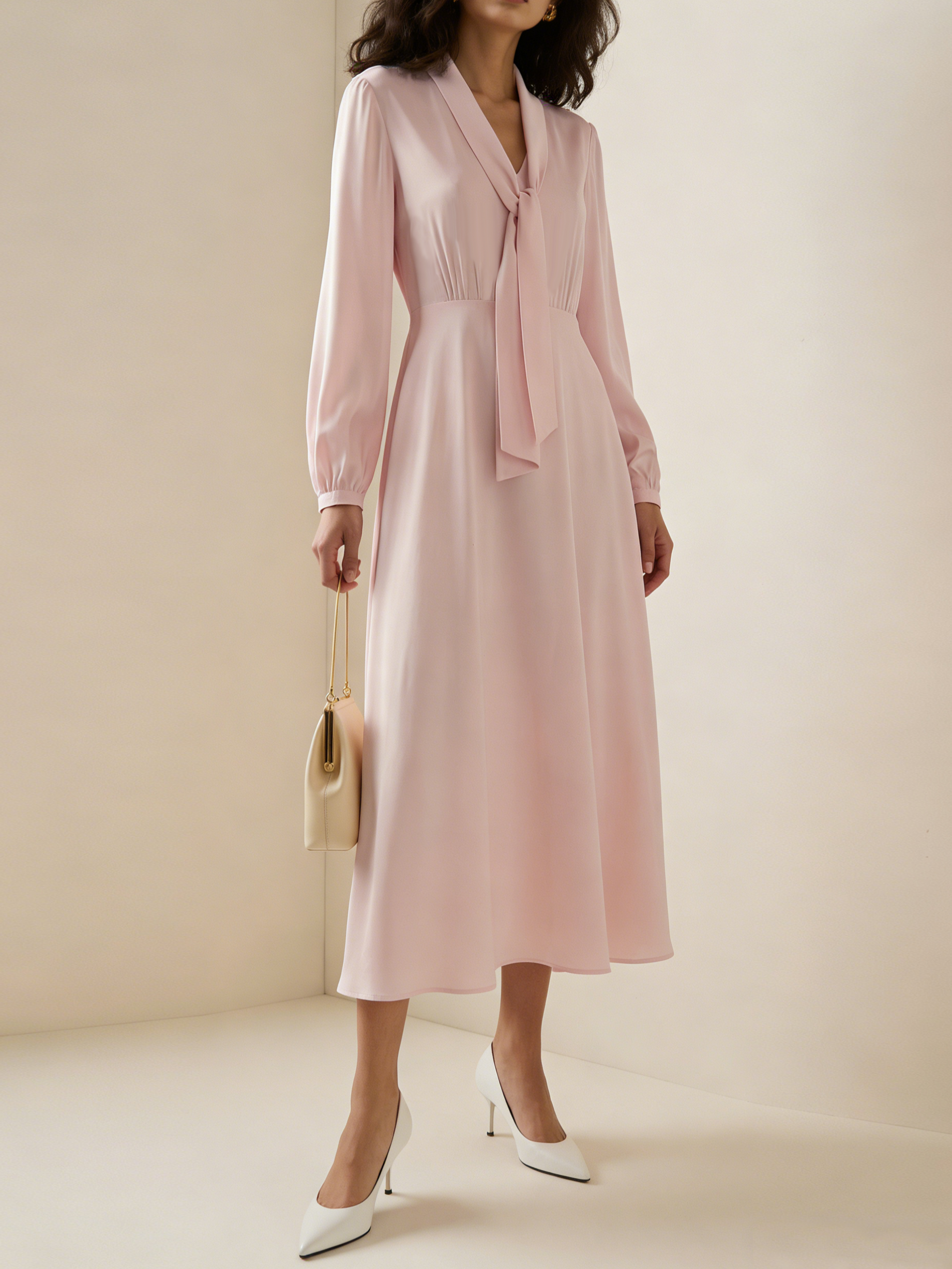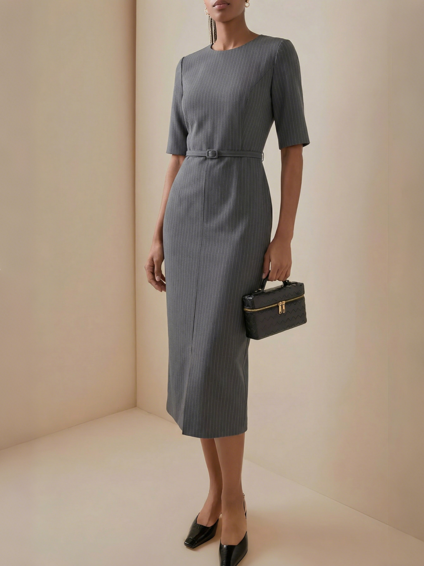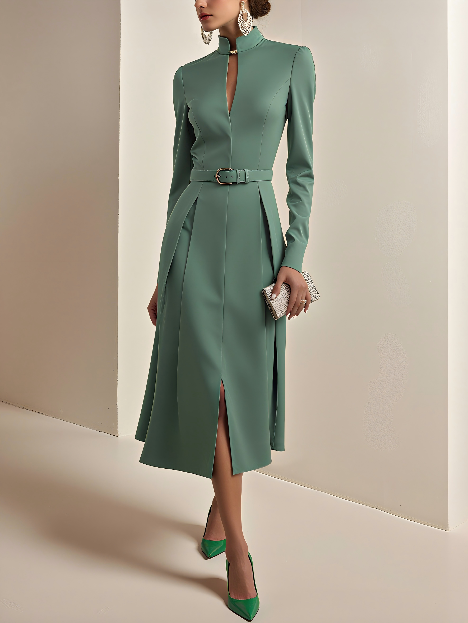 Green Fit & Flare Dress Stand Collar Long Sleeve A-Line Midi Commuting Dress with Belt