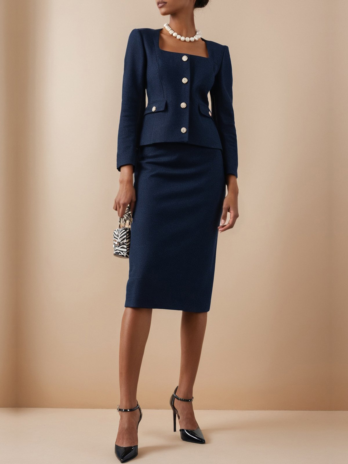 Deep Blue Plain Micro-Elasticity Square Neck Prom Blazer