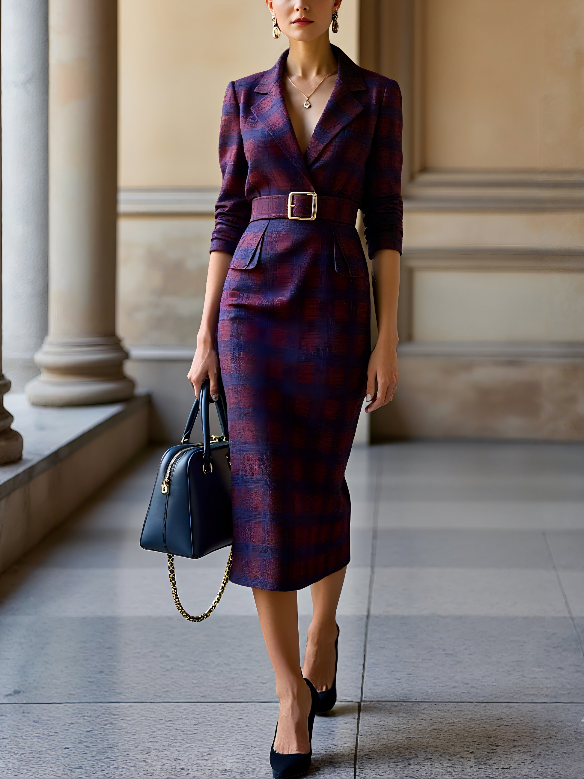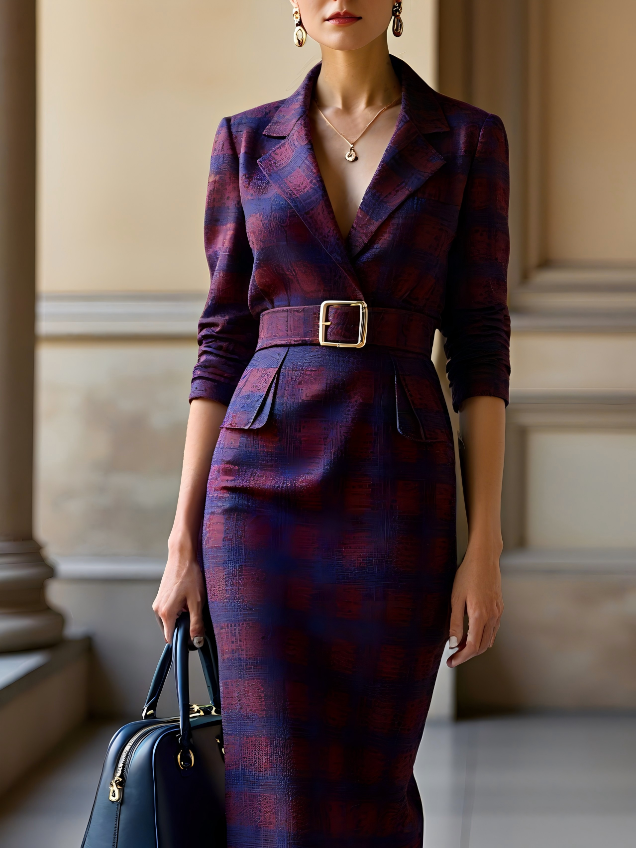Purple Red Lapel Collar Long Sleeve X-Line Midi Commuting Dress with Belt