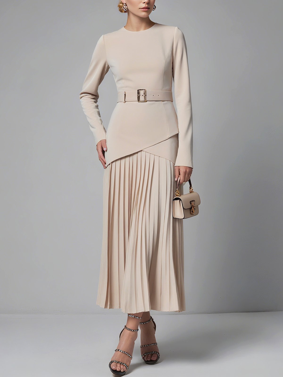 Apricot Split Joint Crew Neck Long Sleeve X-Line Maxi Commuting Dresses with Belt