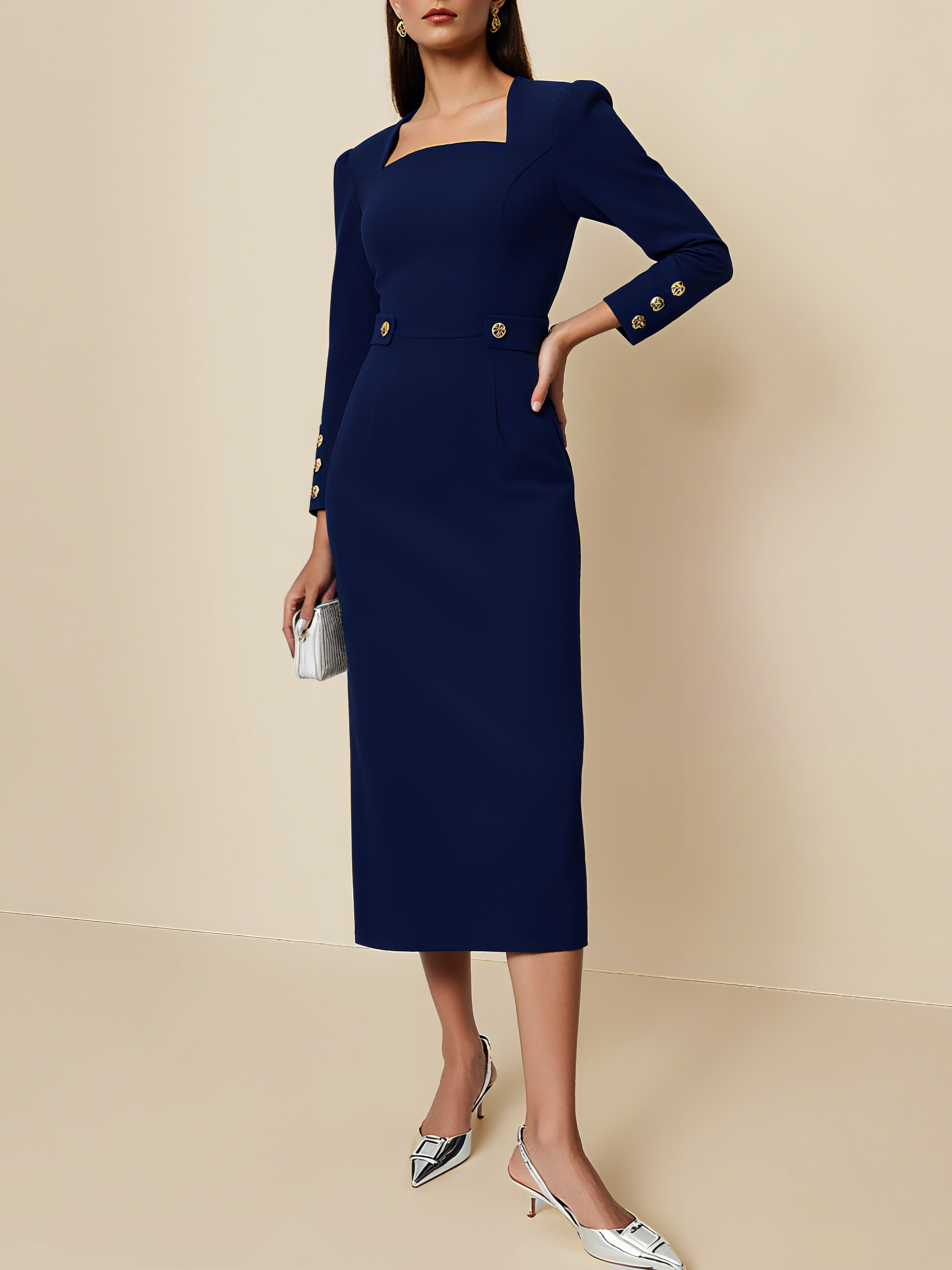 Deep Blue Square Neck Long Sleeve X-Line Midi Commuting Dress