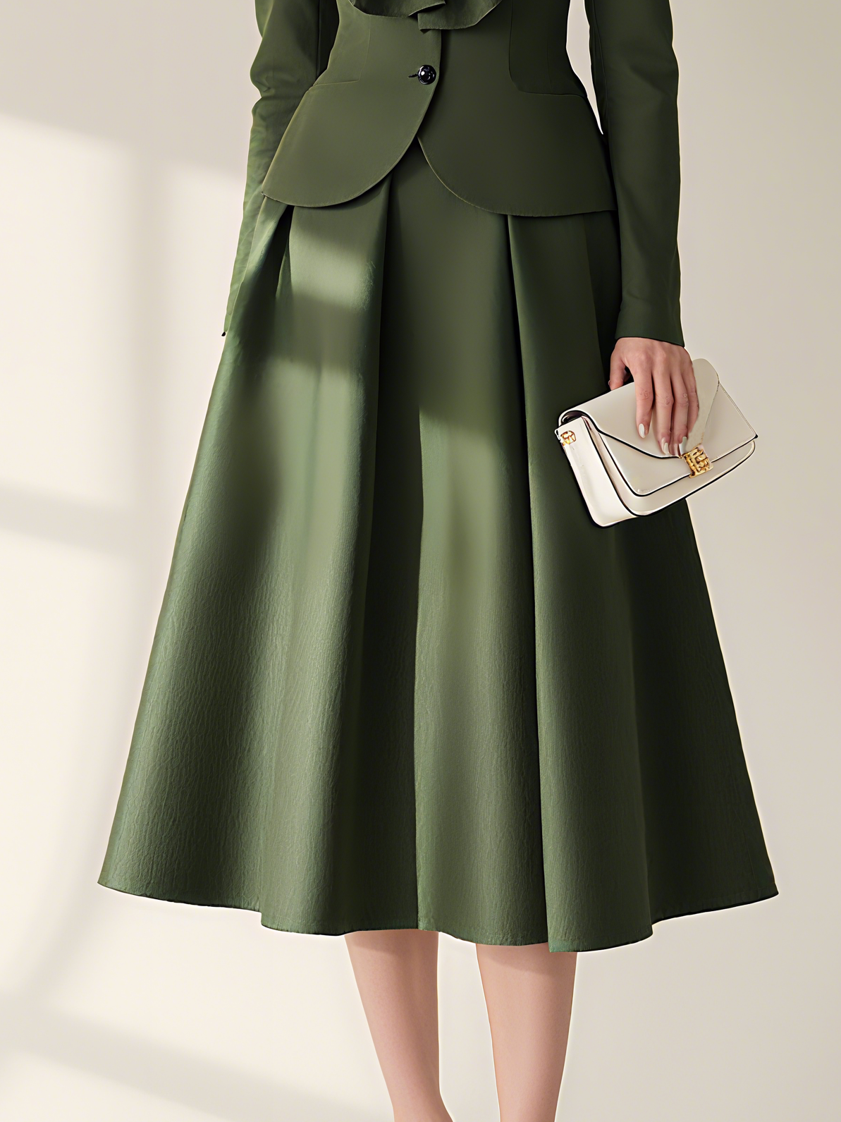 Green Fit & Flare Dress Stand Collar Long Sleeve A-Line Midi Commuting Dress with Belt