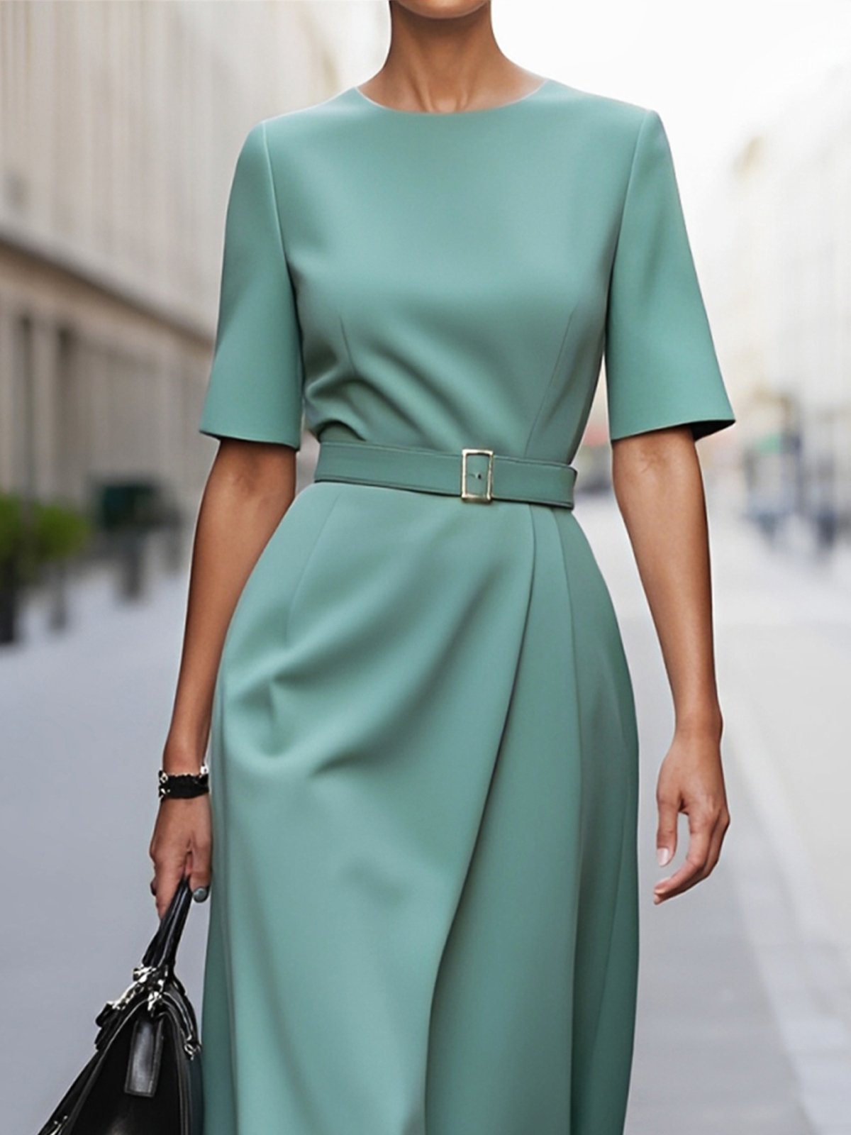 Green Crew Neck Half Sleeve X-Line Midi Commuting Dress with Belt
