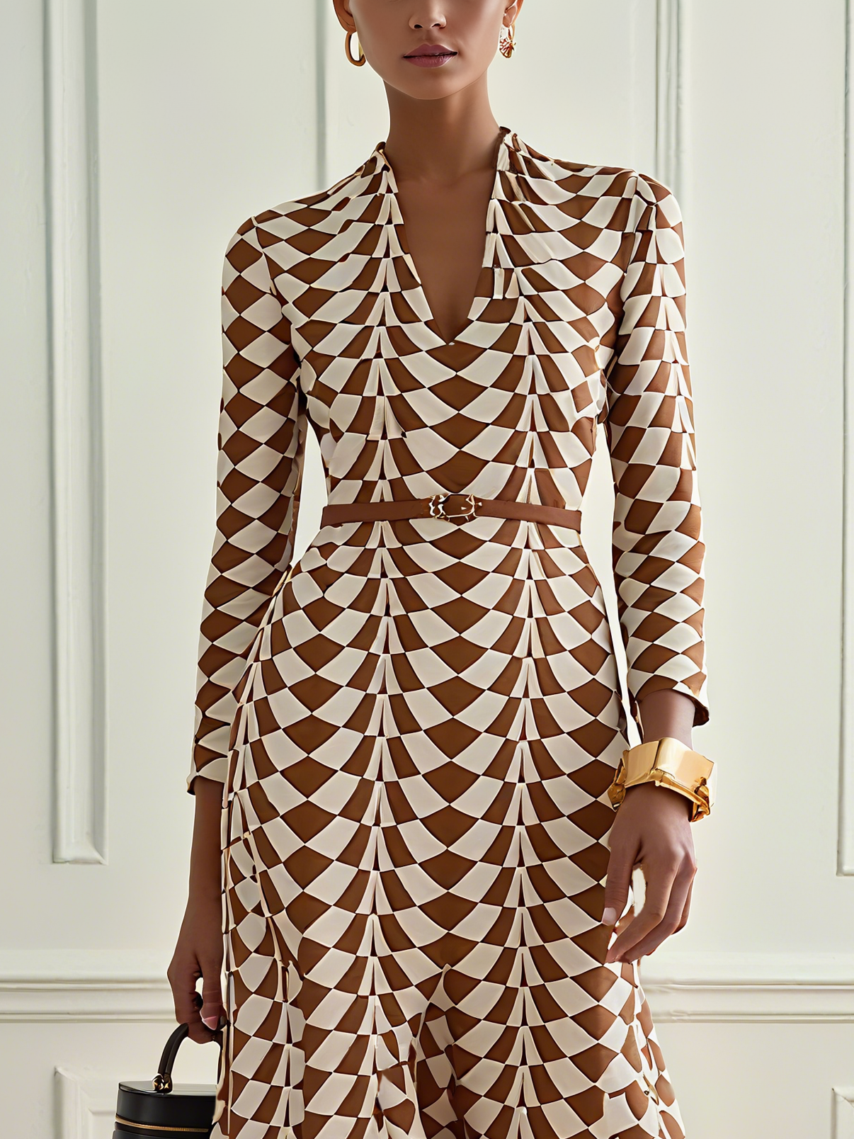 Brown Notched Long Sleeve X-Line Midi Daily Dress with Belt
