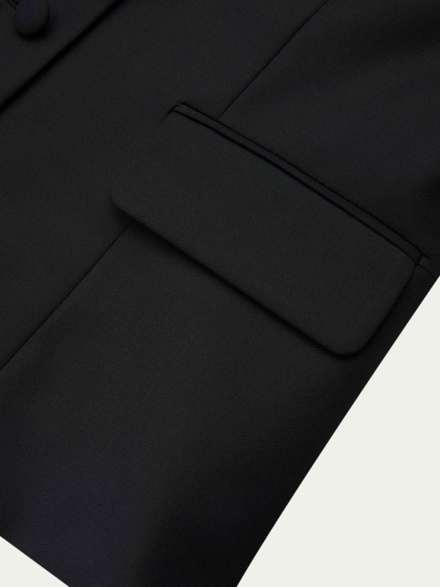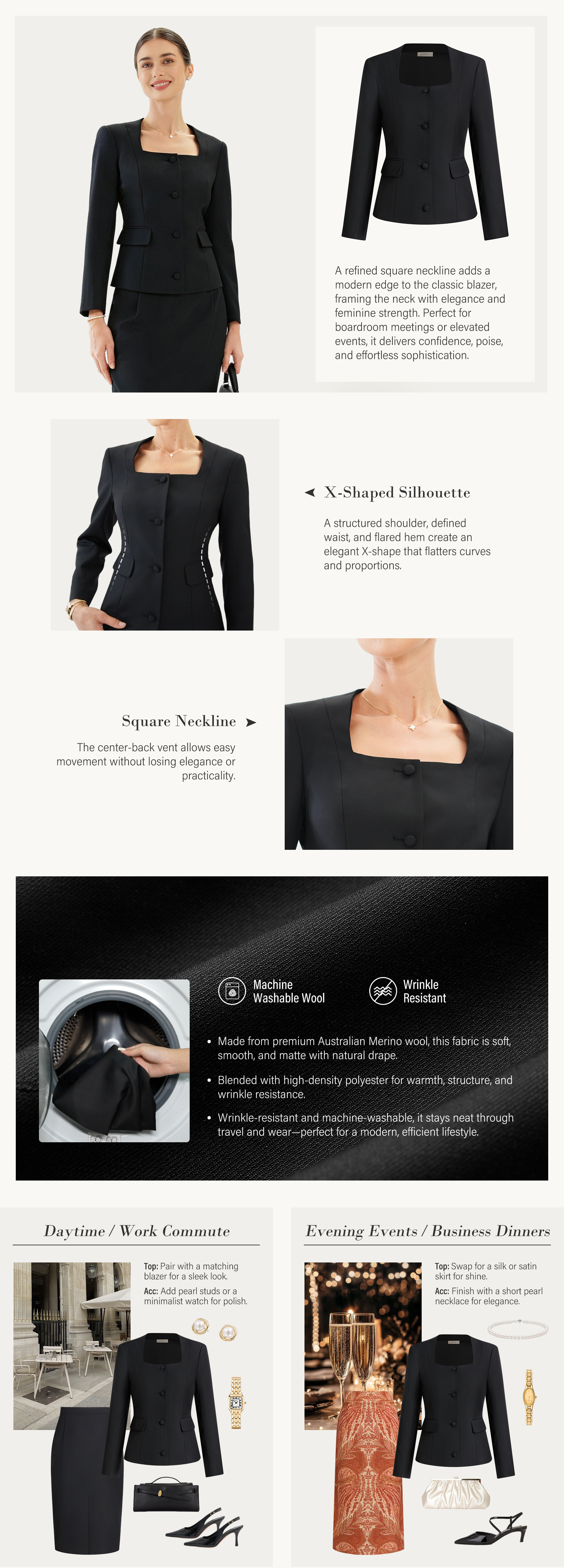 Black Wrinkle-Resistant Wool Square Neck Blazer, Machine-Washable