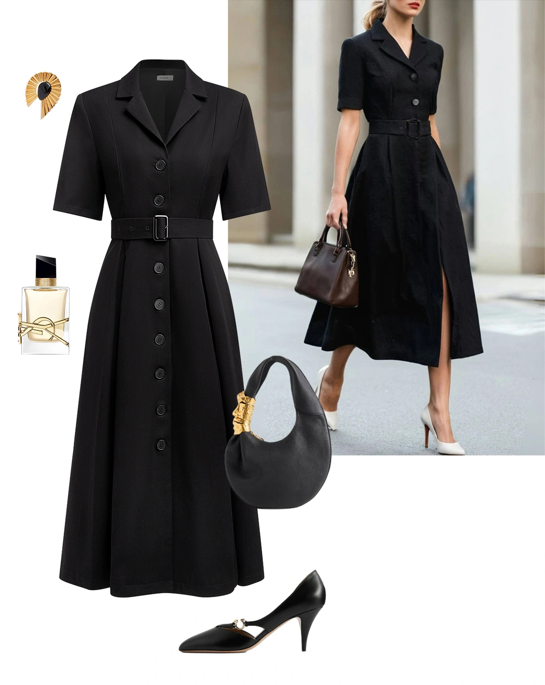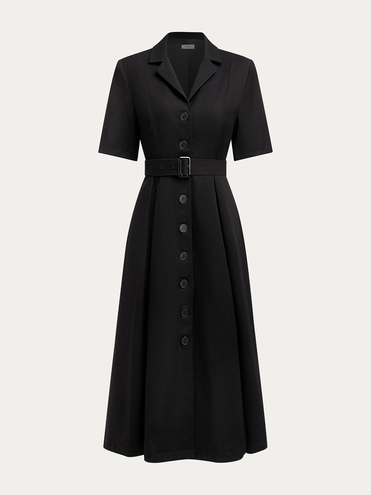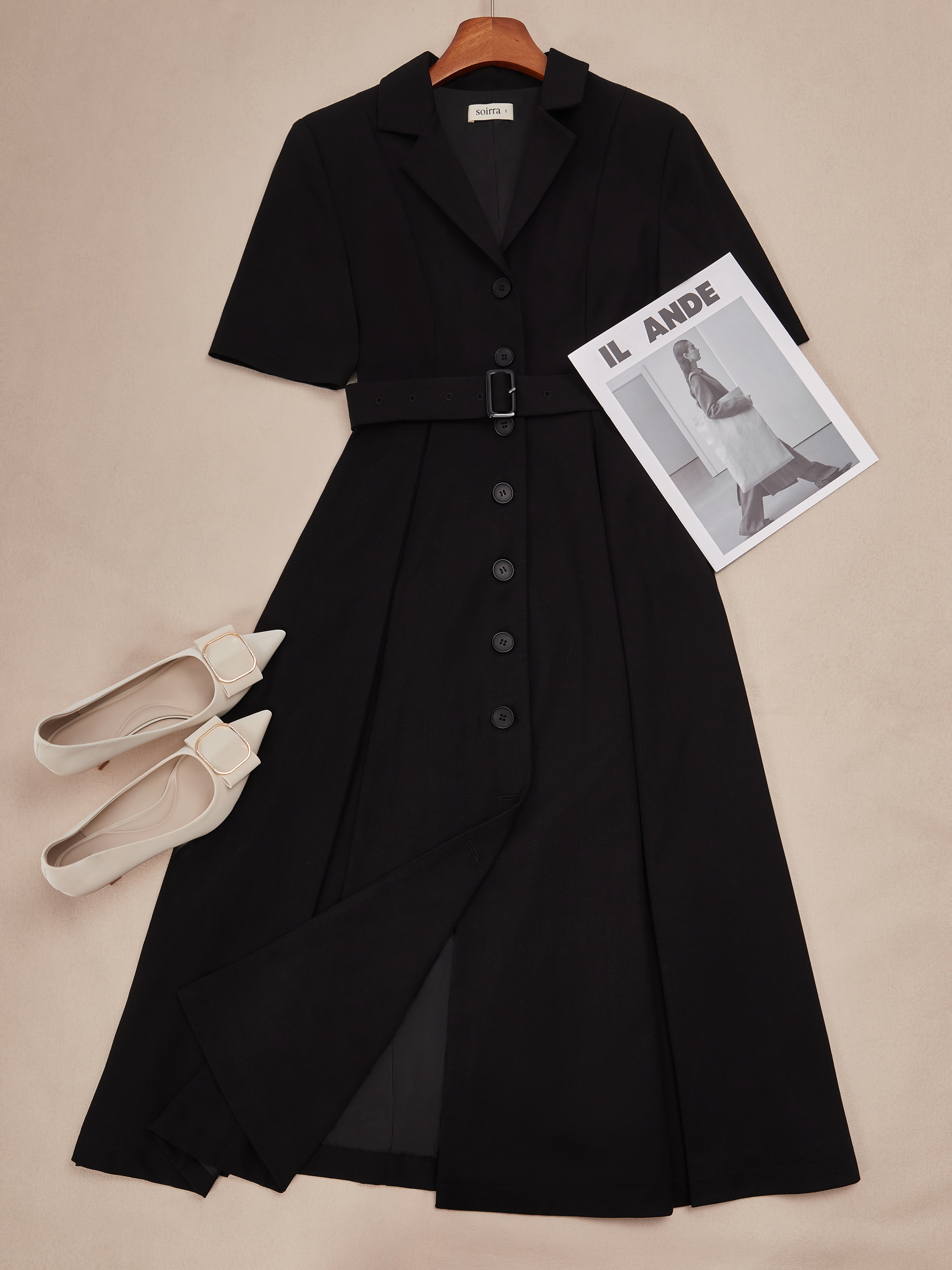 Black Slit Blazer Lapel Collar Short Sleeve X-Line Midi Together Dress with Belt
