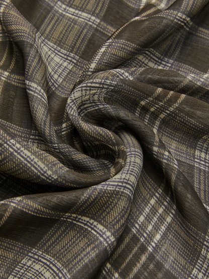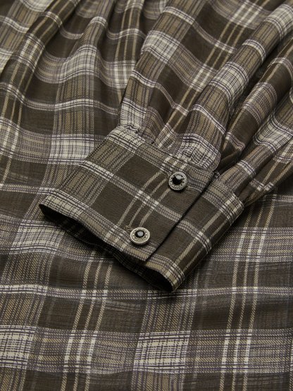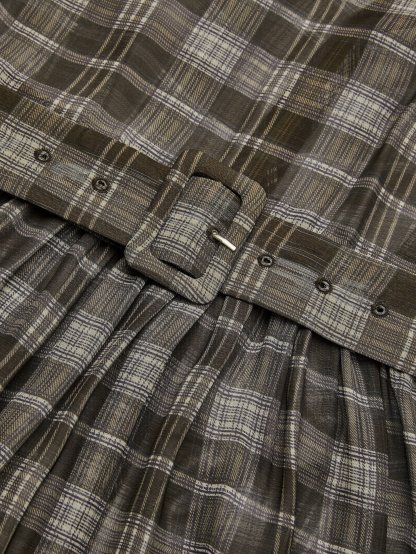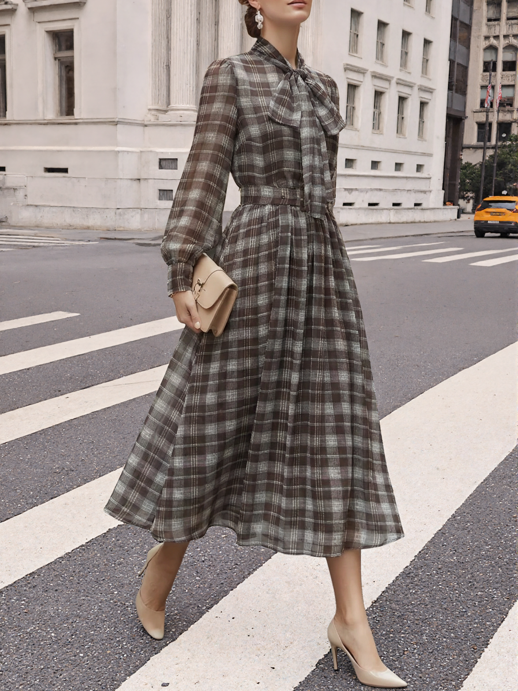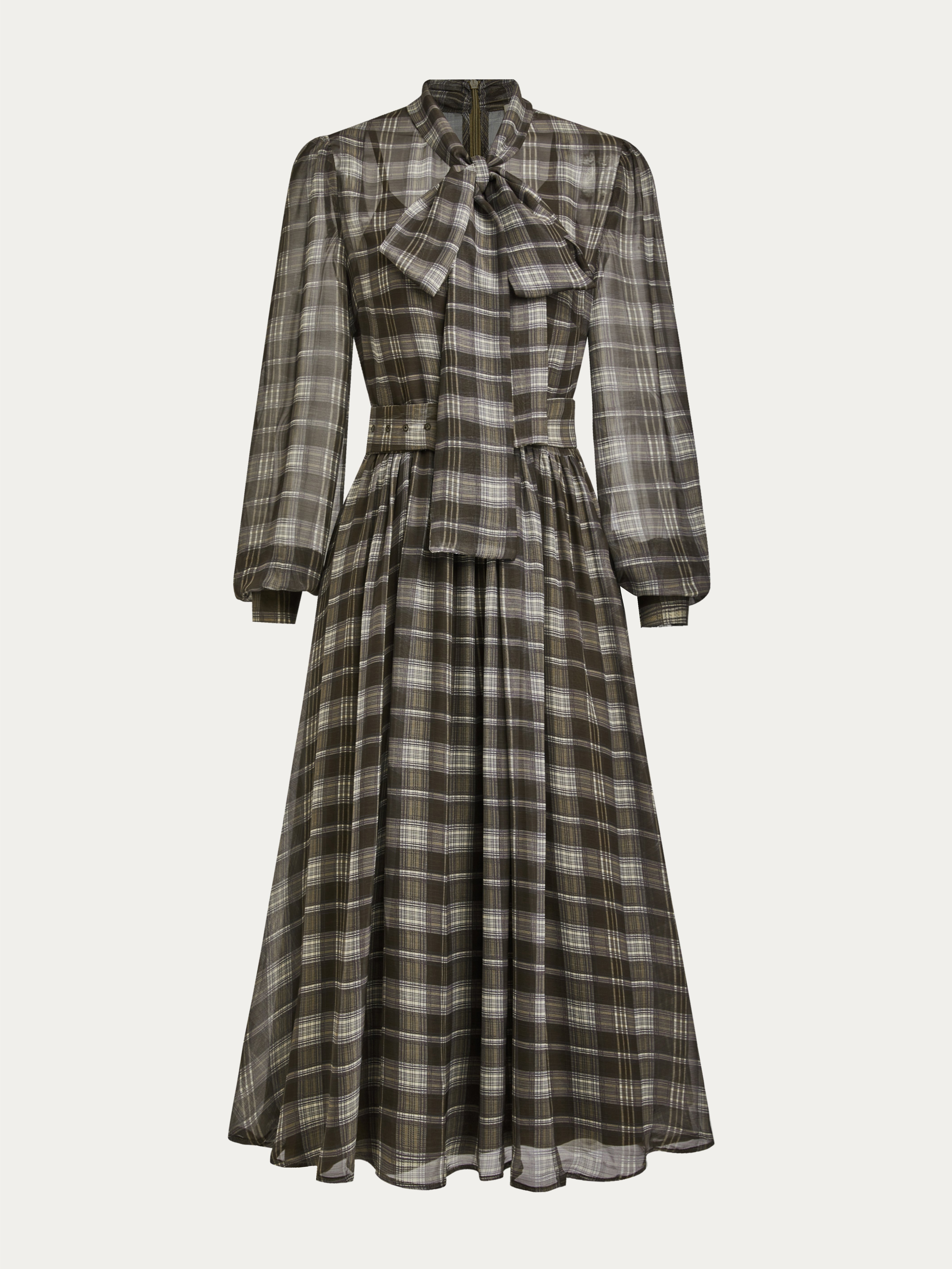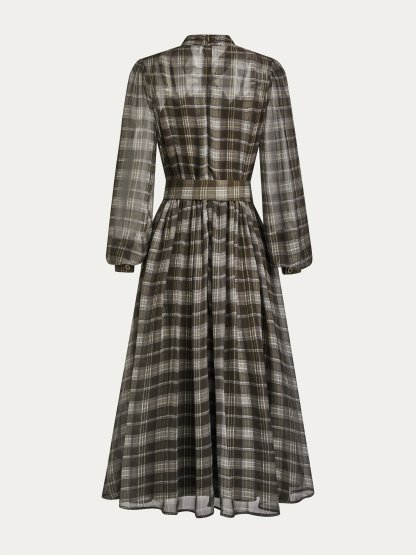 Gray-Brown Wrinkle-Resistant Tie Neck Long Sleeve A-Line Midi Commuting Dress