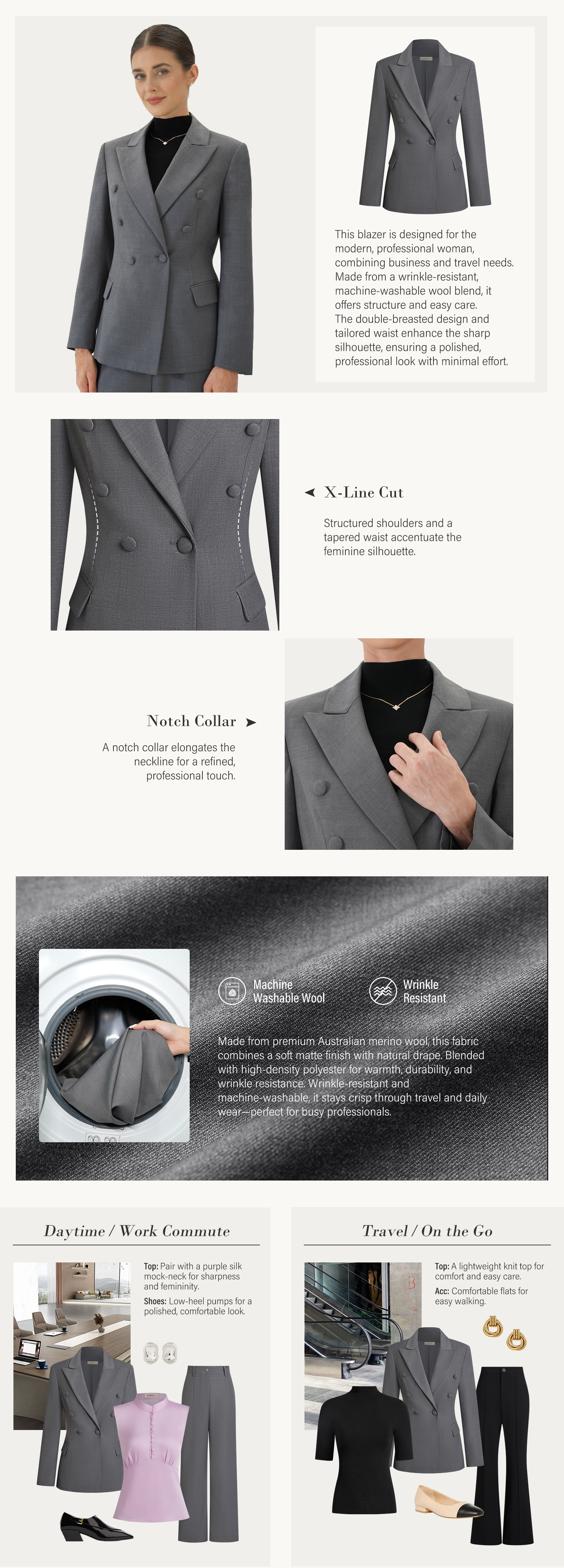 Gray Wrinkle-Resistant Wool Lapel Collar Blazer, Machine-Washable
