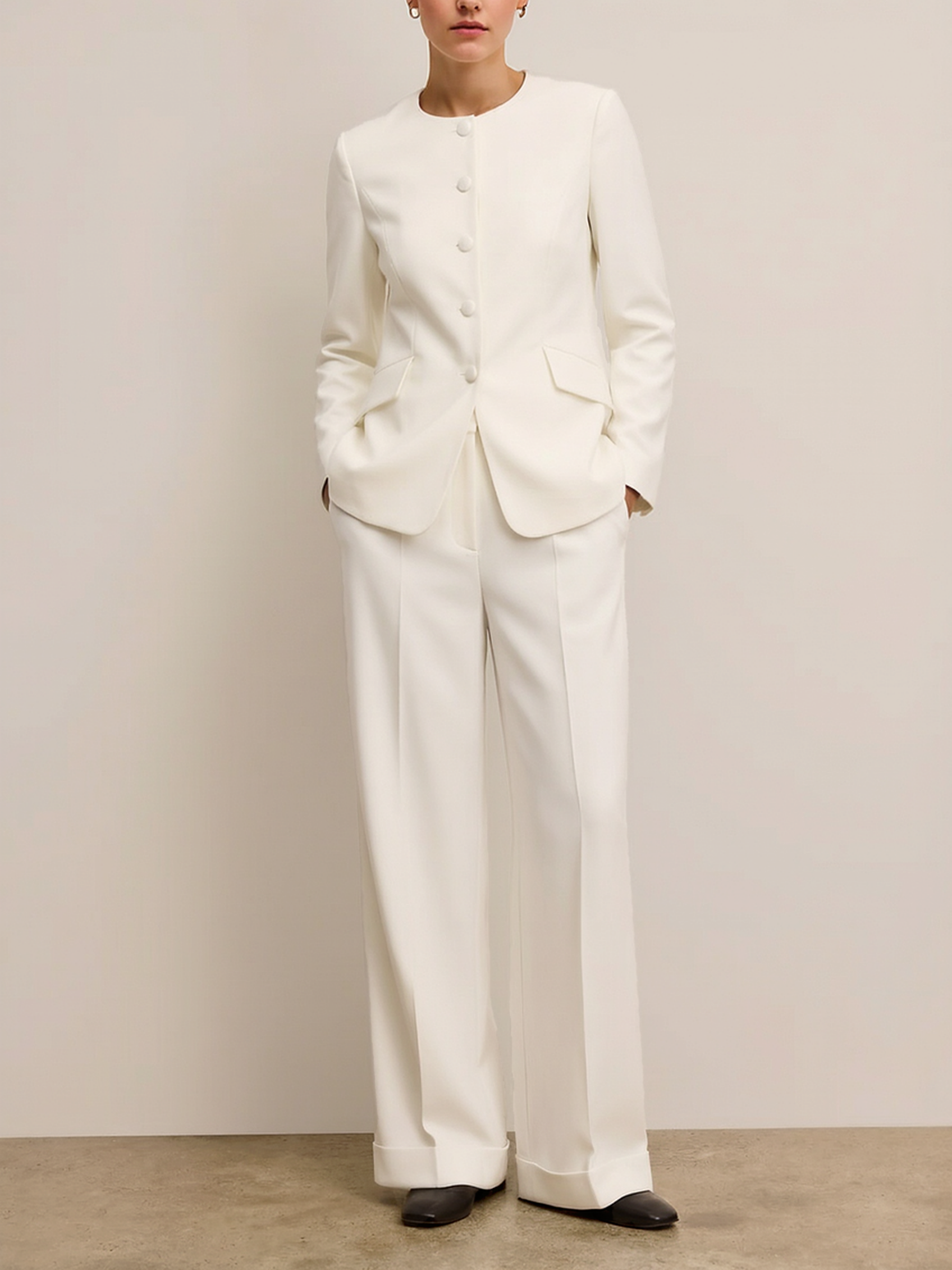 White Straight-Leg Pants with Adjustable Hem Buttons